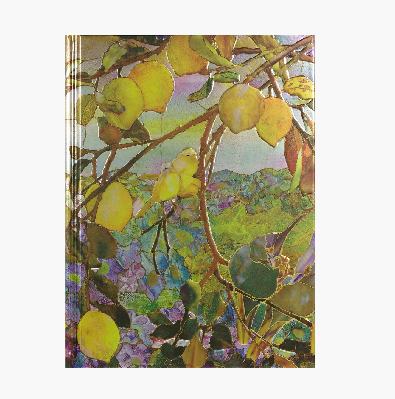 Elegant journal replicates a favrile mosaic of birds perching in the branches of a lemon tree, created by Tiffany Studios in 1910.