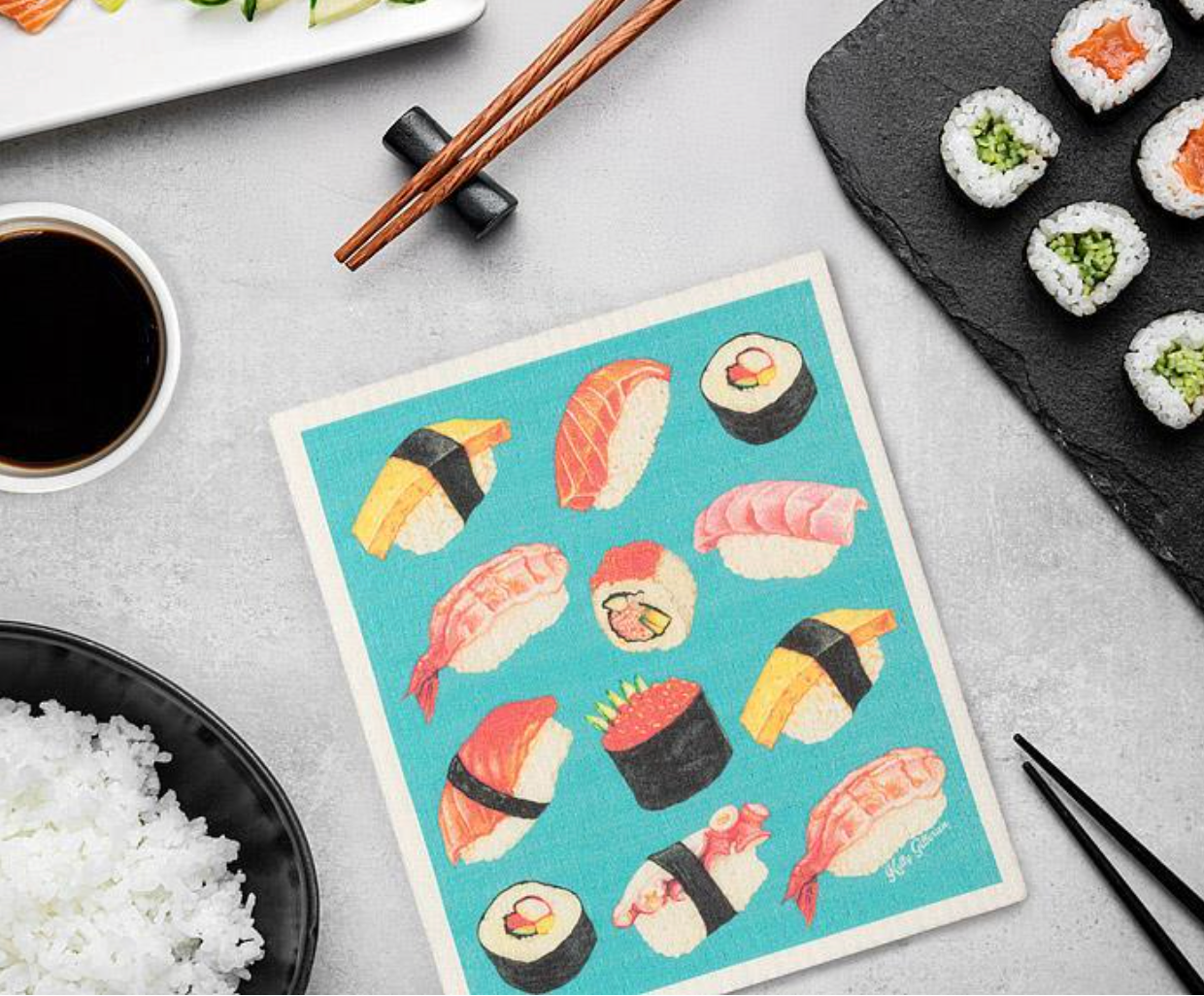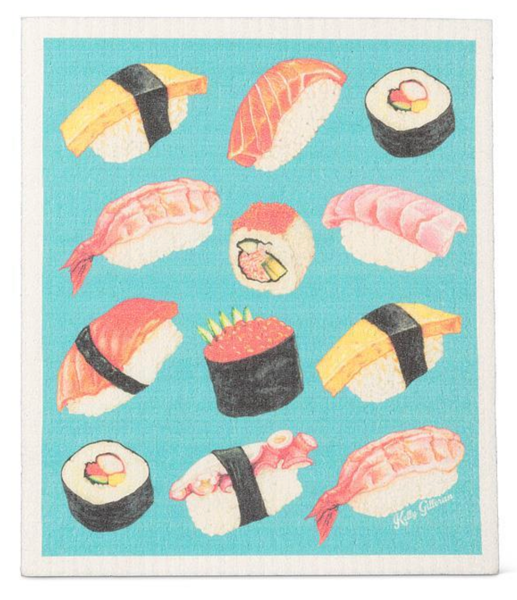 Clean your kitchen like a sushi master. Covered in a cheeky assortment of nigiri and maki, this dishcloth turns chores into a delicious visual treat.