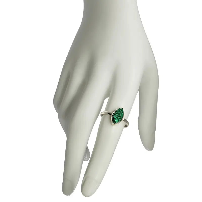 Malachite sterling silver ring. Marquise-shaped malachite stone is set in .925 sterling silver.
