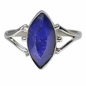 Faceted sapphire stone sterling silver ring. Marquise-shaped stone is set in .925 sterling silver.