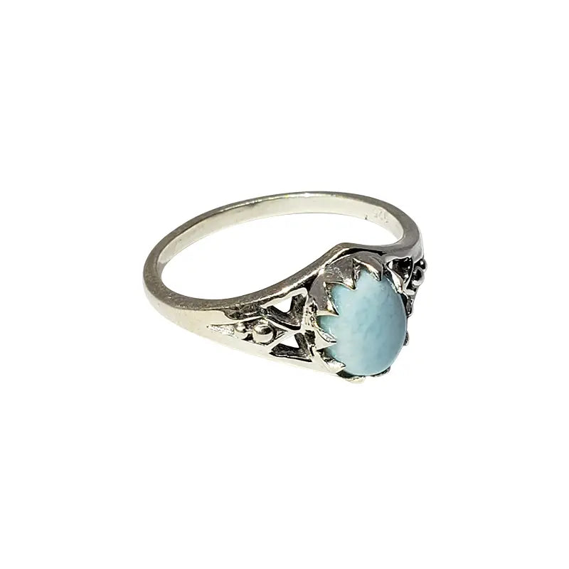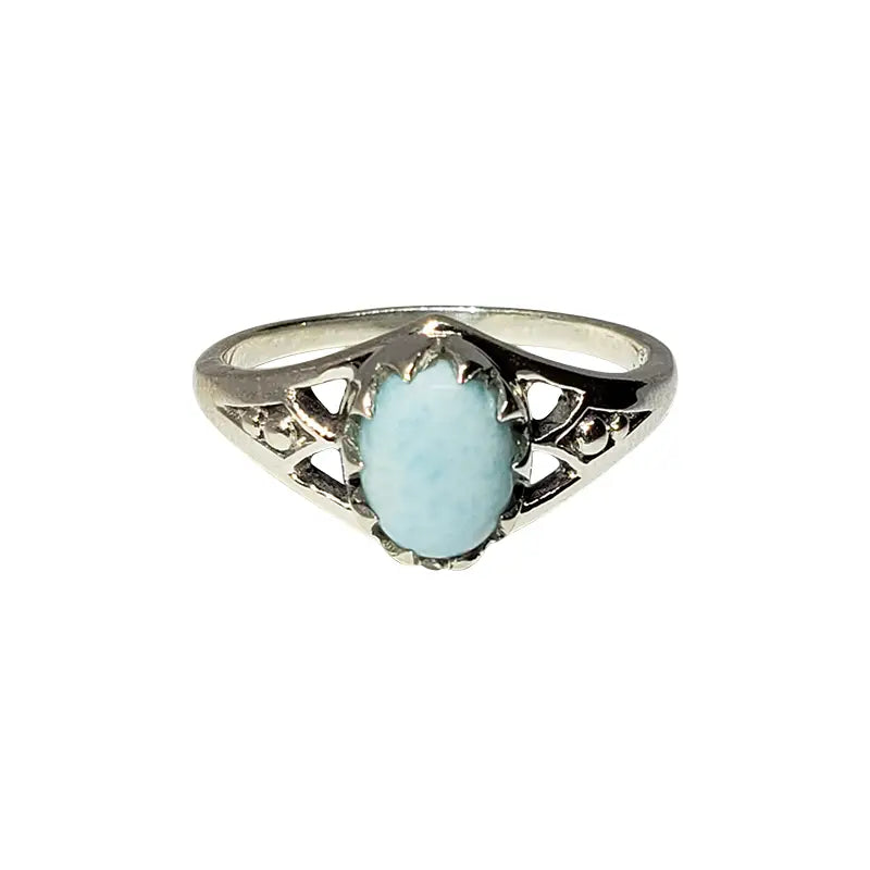 Larimar Sterling Silver Ring. The oval-shaped larimar stone is set in .925 sterling silver.