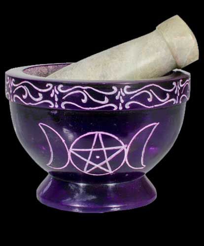 Purple Soapstone Mortar & Pestle with Triple Goddess/Pentacle Symbol